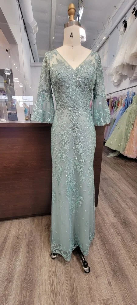 This Gown is an Embroidered Sheer Overlay Gown with Bell Sleeves and Sequin Embellishments