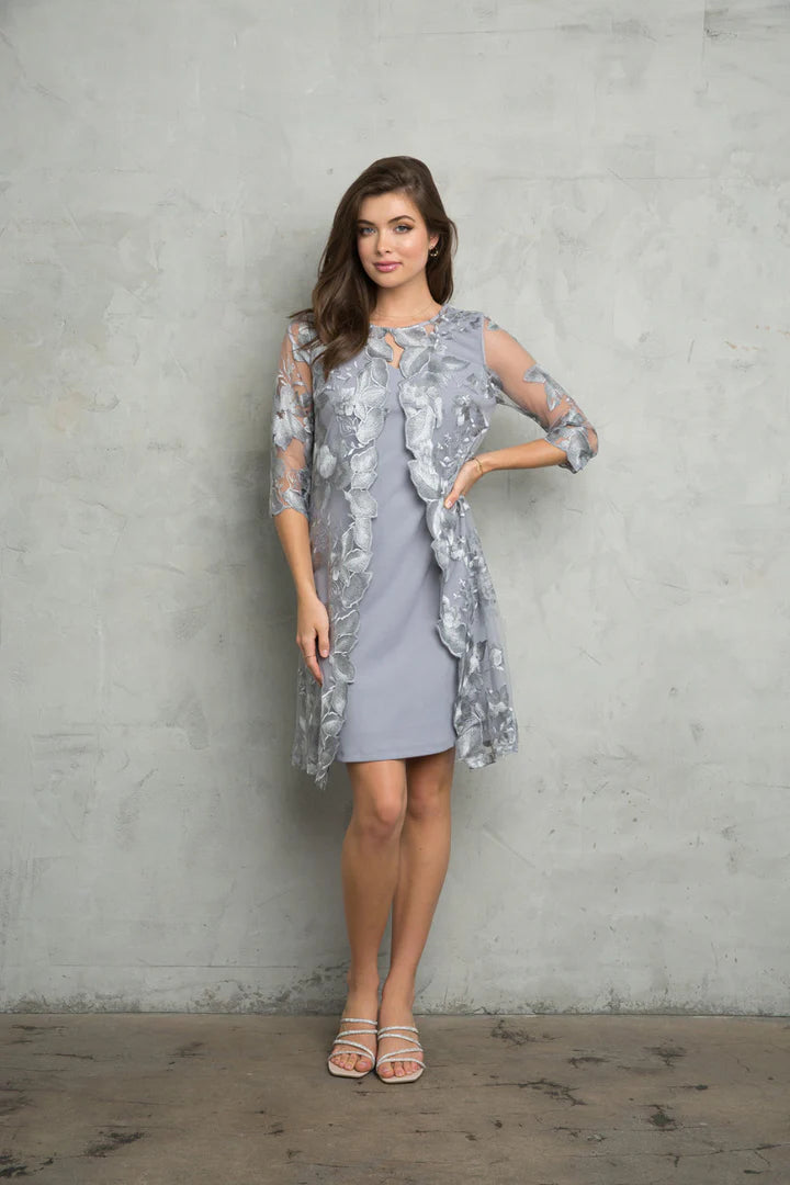 This dress features a knee-length dress complemented by a matching attached jacket, which is ideal for sophisticated formal occasions and wedding guests alike. Adorned with intricate lace embroidery and meticulous 3/4-sleeve detailing. Made with Soft Cup Padded Inserts, Fully Lined, Embroidered Lace, attached Jacket.