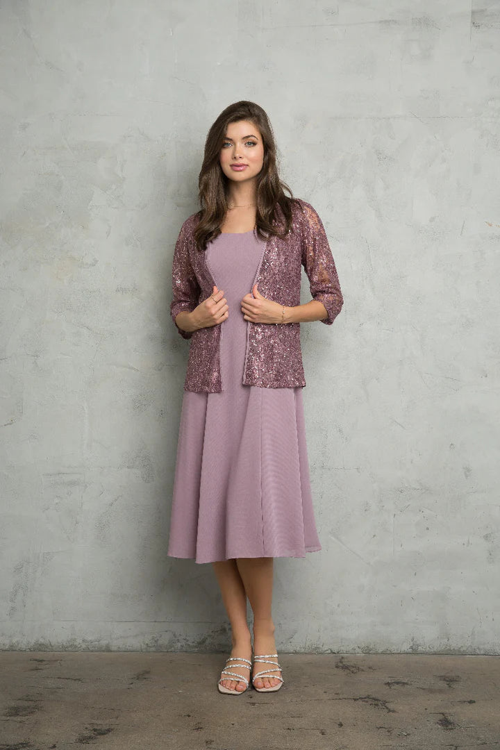 This 2-piece dress shows a sheath outline with wide straps, offering comfort and support. Ideal for mothers seeking timeless charm and a flattering fit, it combines classic design with a modern lace 3/4 sleeve jacket.
