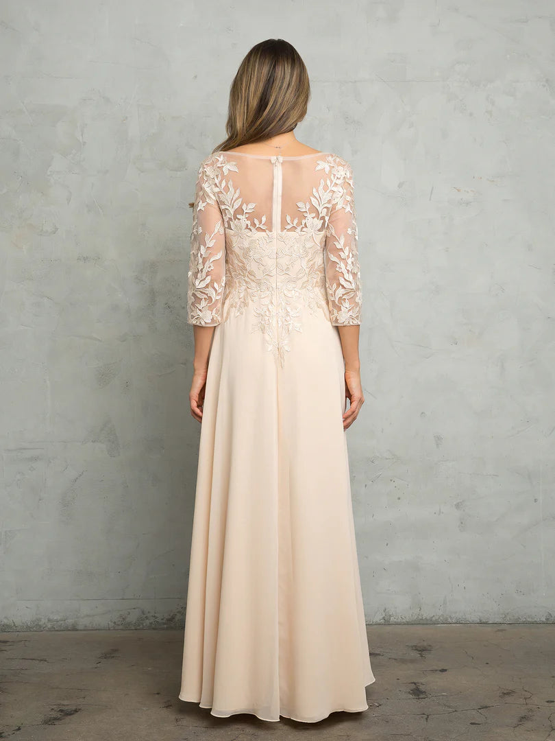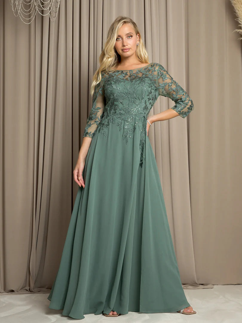 The dress features a sheer lace bodice with intricate floral embroidery and 3/4 length sleeves for graceful coverage. The flowing A-line silhouette is enhanced by a lightweight chiffon overlay that adds movement and a touch of romance. Lace 3/4 Sleeve A-Line Evening Gown with Chiffon Overlay
