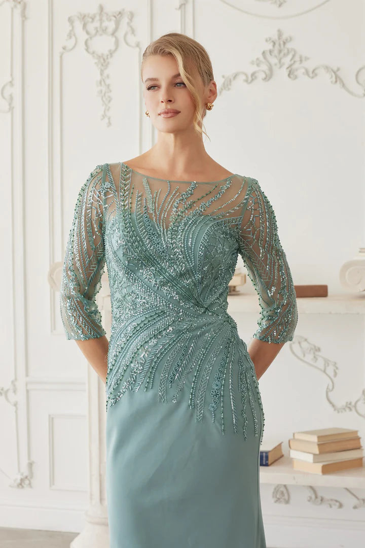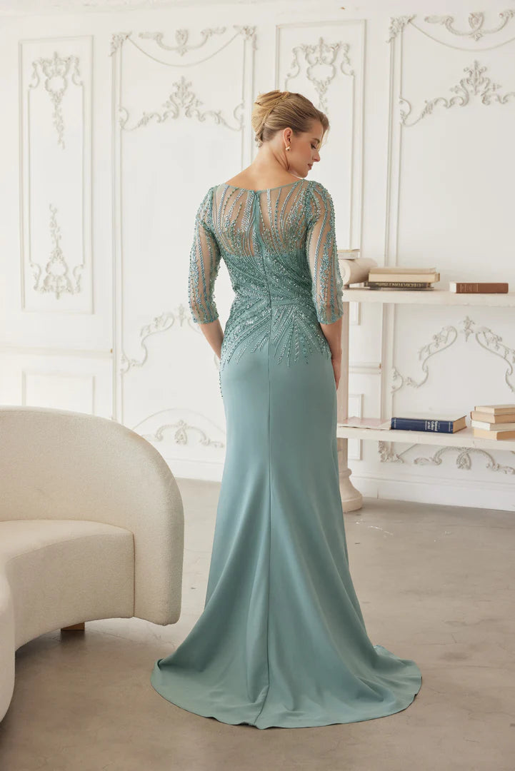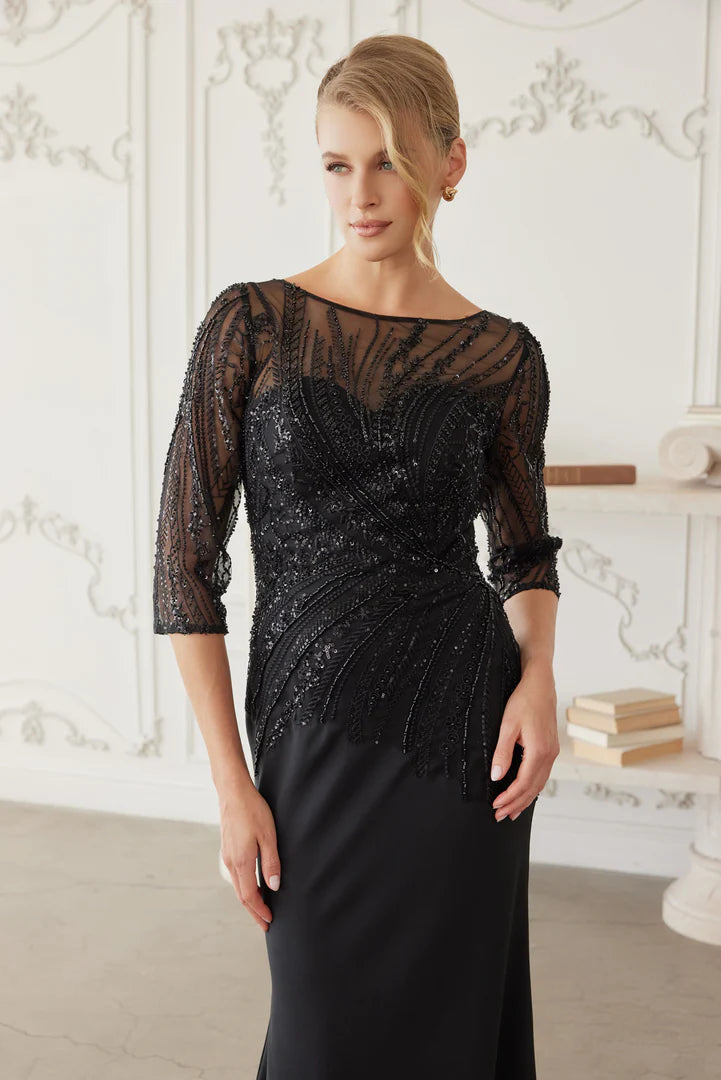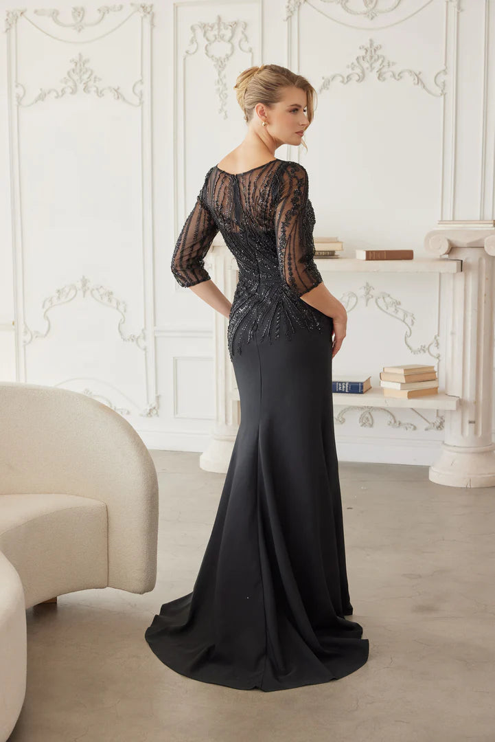 This gown is a long-sleeve beaded satin mother-of-the-bride dress. Designed with timeless sophistication, this evening gown features a fitted silhouette that gently flares into a floor-length skirt, creating a flattering, graceful silhouette for all body types. The illusion mesh bodice is intricately adorned with hand-sewn beads