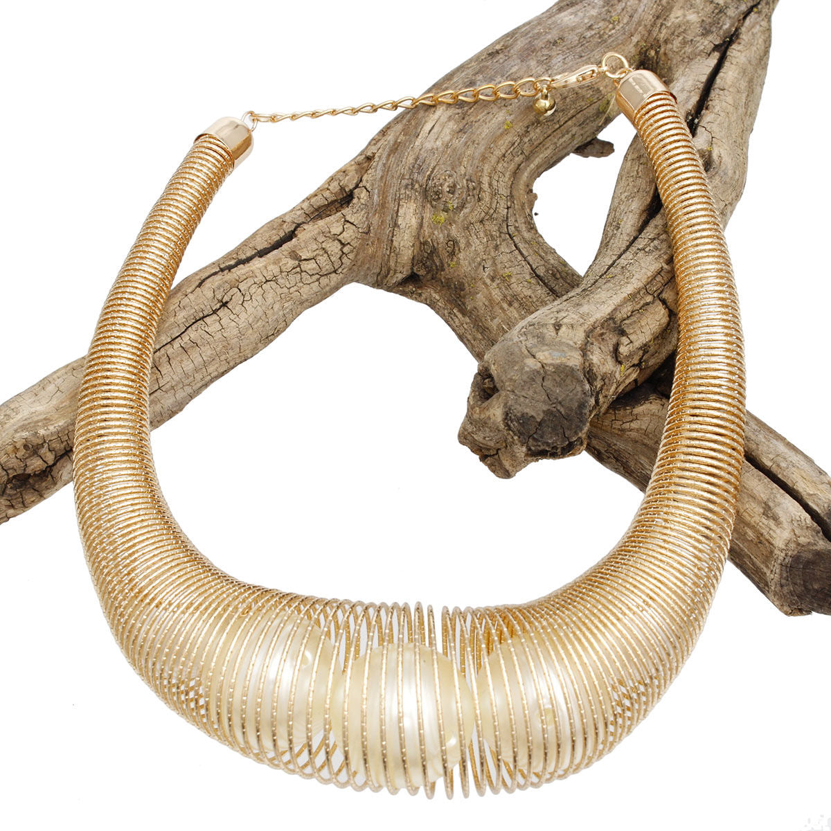 Women's Collar Necklace Set. Unique and Chic Textured Graduated Design Hollow Gold Metal Spring Design Collar Necklace Filled with 5 Jumbo Acrylic Cream Pearls. Center of Necklace Measures 1.75" wide. Lobster Clasp Closure. Includes Matching Pearl Ball Stud Post Backing Earrings.
