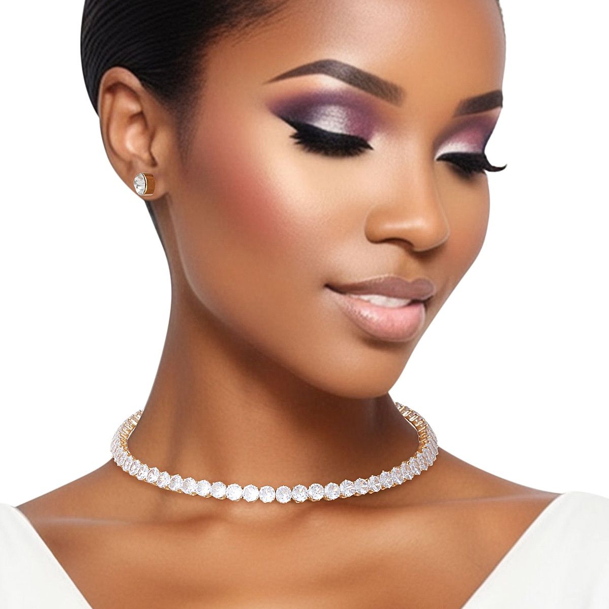 Women's Memory Wire Choker Necklace Set. Dazzling Gold Metal Memory Wire Wrap Choker Necklace Featuring Twinkling Clear Rhinestones. Adjustable. 1 Row Measures .25" wide. Includes Matching Rhinestone Stud Post Backing Earrings.