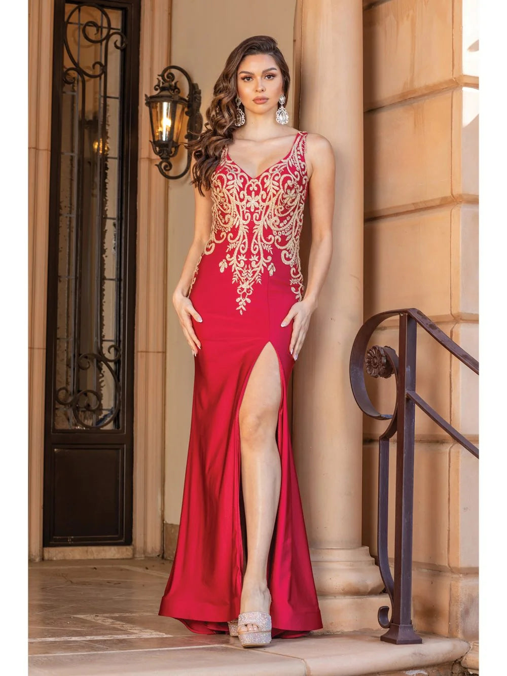 This Gown is an Embellished Bodice Gown with Sleeveless Cut, Thigh-High Slit, and Mermaid Tail Prom Dress
